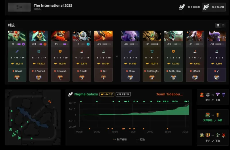 虎扑09月12日讯 在刚刚结束的2025DOTA2国际邀请赛(TI14)败者组首轮比赛中,CN赛区战队Tidebound被Nigma Galaxy以2-0横扫,最终止步本次赛事八强未能进入前六。而本次赛事剩下的CN赛区战队也仅有XG一支。XG将在随后的胜者组半决赛对阵PVISION